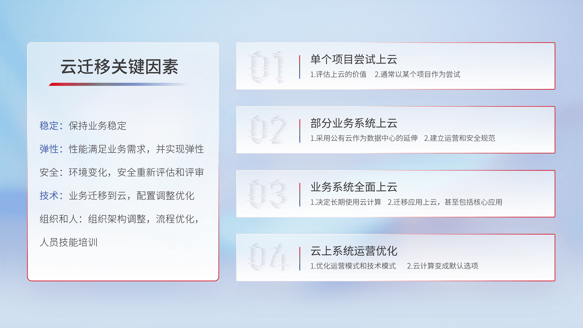 结合实际业务,,,从规划设计、、云平台选型、、、云原生改造、、、、数据迁移、、集成交付,,迁移全过程为客户识别最佳上云路径,,做好风险识别管理,,设计网络架构、、、、身份权限、、安全审计合规、、、操作审计、、日志审计、、、、监控告警策略、、多站点容灾设计等,,,,对云上基础设施进行整体规划,,,,提升IT治理水平,,以满足弹性、、、、高可用、、高性能的需求。。