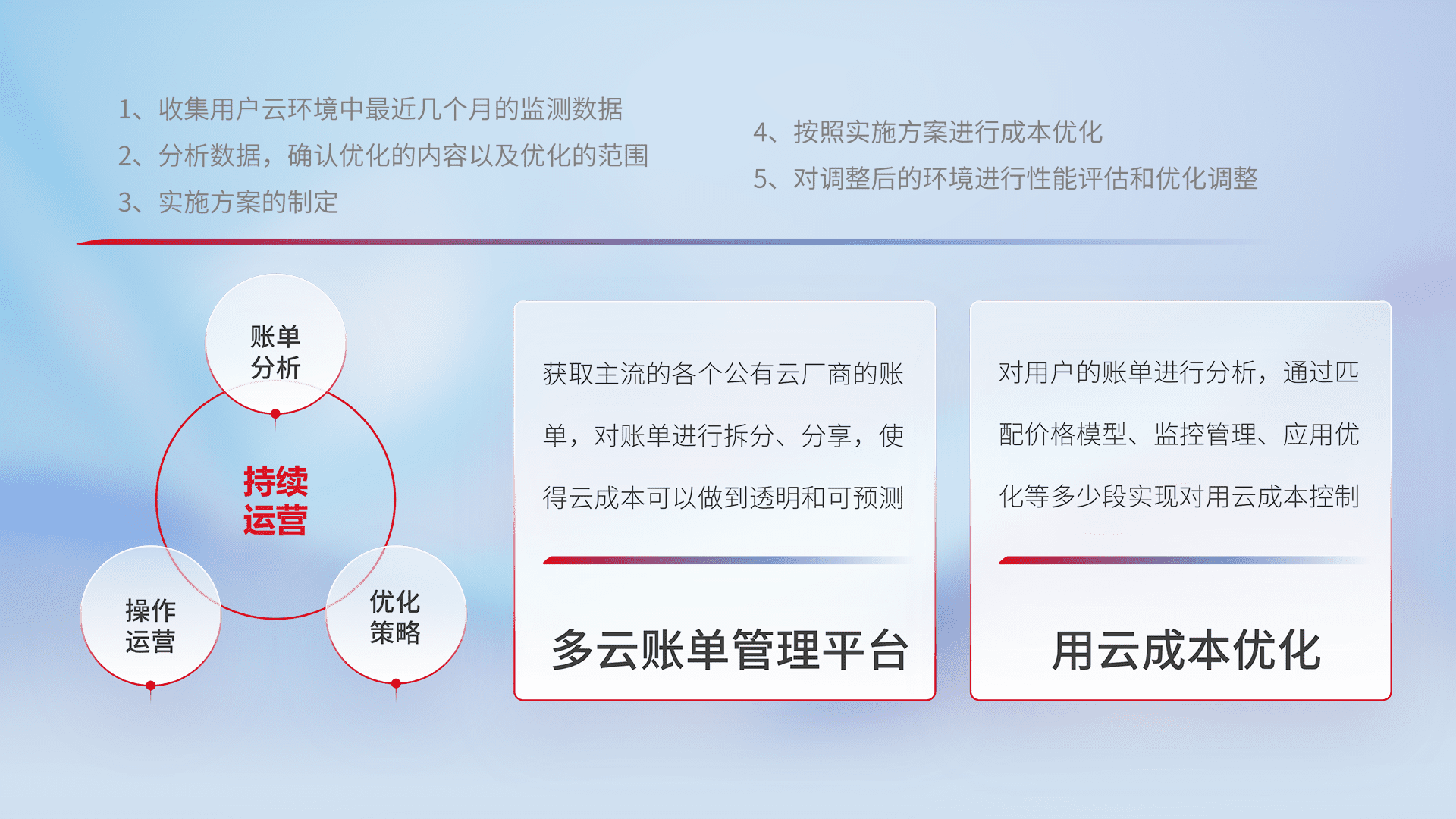 通过多云纳管,,以统一的资源数据模型把客户的云资源进行抽象和封装,,进而实现对多云资源的统一操作,,,保障云资源管理的可靠性、、稳定性与可用性。。。量身定制化运维内容,,配置、、开发运维、、、补丁管理、、、、备份、、监控、、、认证和访问管理、、、审计和日常巡检等,,,保障在用云过程中的可靠度,,,稳定度以及高可用率。。